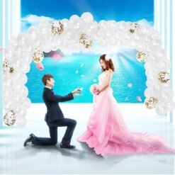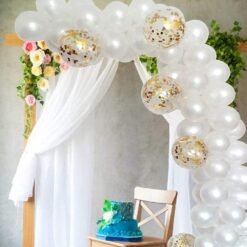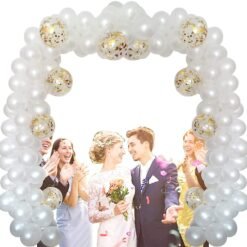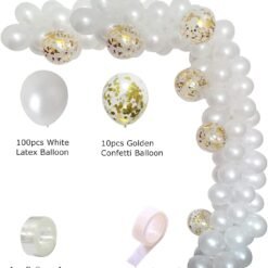 100pcs 10inch White Latex balloons + 10 Gold Confetti Balloons ). Whole Balloon Garland Accessories Kit – (1 roll of 16feet arch balloon strip tape + 1 roll of 100 glue dots ).