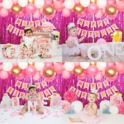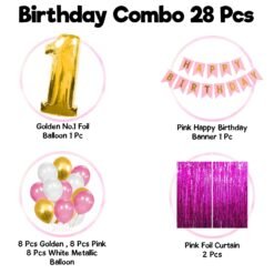 1pc pink happy birthday banner, 8Pcs pink metallic balloons, 8pcs white metallic balloons, 8Pcs golden metallic ballons, 2Pcs pink foil curtains, 1Pc 1 shape golden foil balloon. This special birthday decorations for girls 1st birthday set is curated because of high demand from mothers of birthday girl.