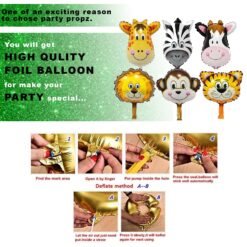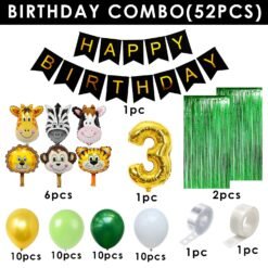 1pc black happy birthday banner, 6pcs animal foil balloon, 2pcs green foil curtain, 10pc golden, 10pcs dark green, 10pcs light green, 10pcs white metallic balloons, 1pc glue dots, 1pc golden number 3 foil balloon and 1pc arch.