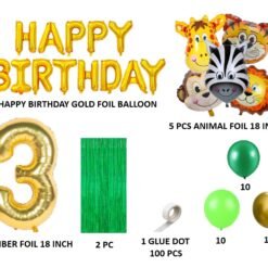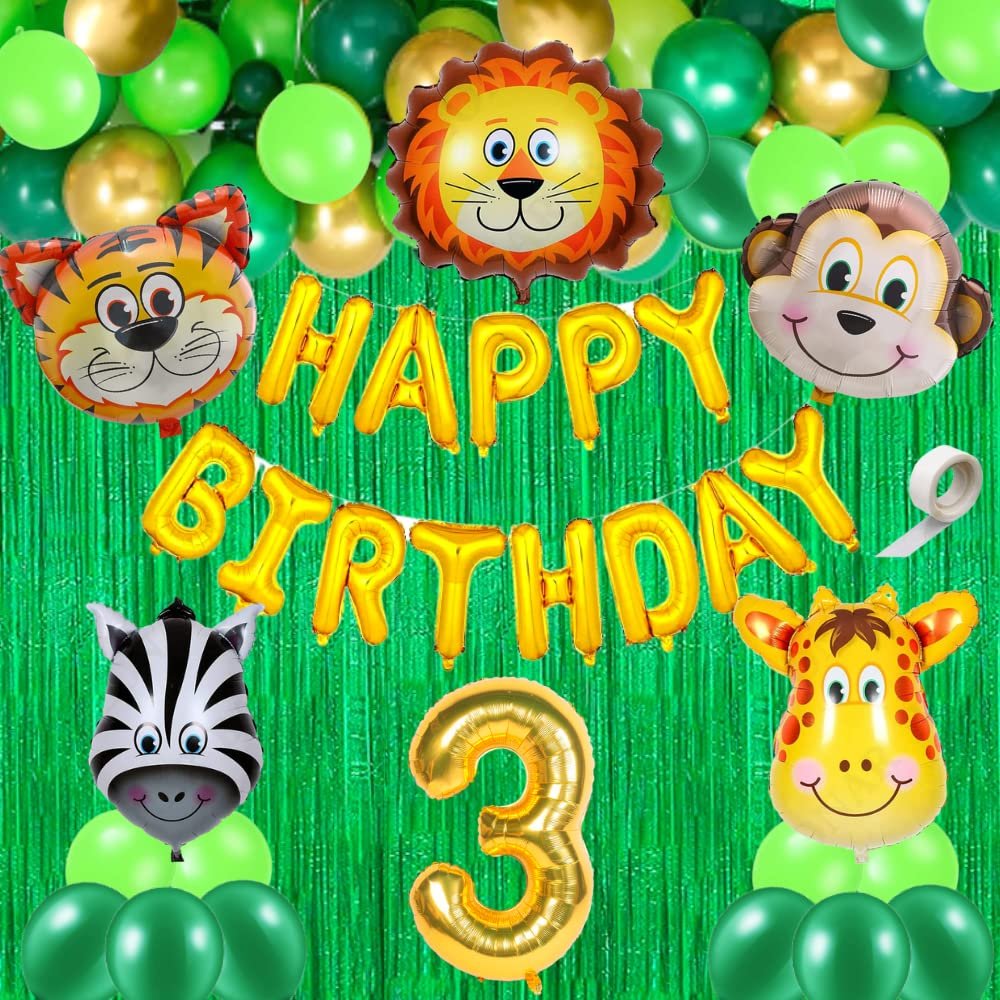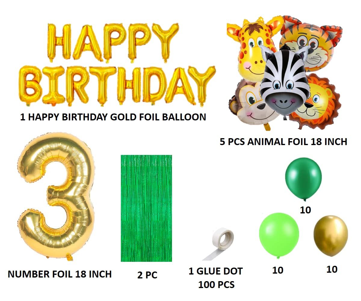 1 happy birthday foil banner (13 single pcs) 2 pcs green curtain, 10 pcs green, 10 pcs light green, 10 pcs gold metallic balloons, 1 pc glue dot (100 pcs), 5 pcs animals face foil balloons, Number Foil 3 Balloon 16 inch