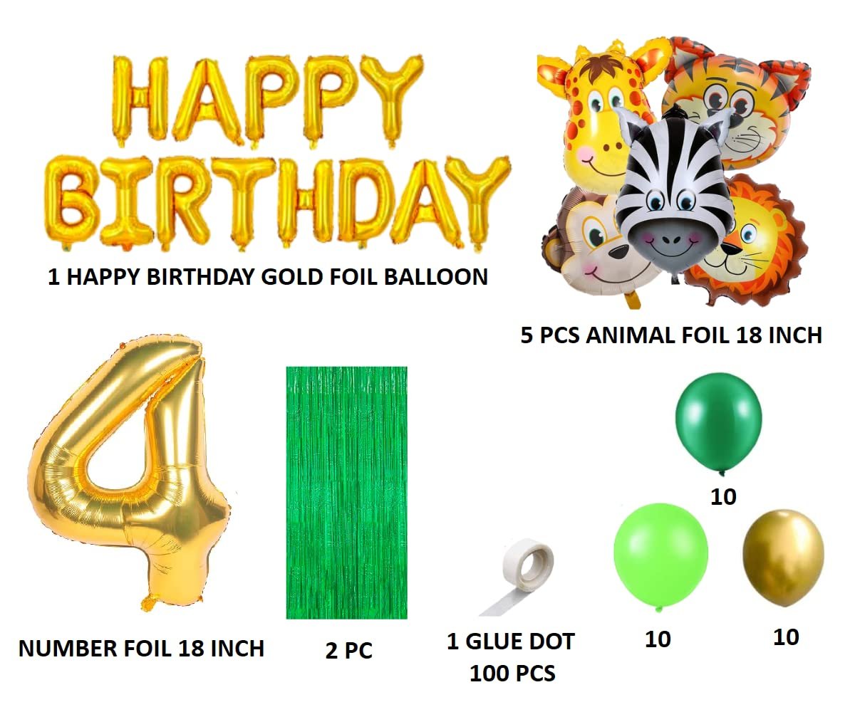 1 happy birthday foil banner (13 single pcs) 2 pcs green curtain, 10 pcs green, 10 pcs light green, 10 pcs gold metallic balloons, 1 pc glue dot (100 pcs), 5 pcs animals face foil balloons, Number Foil 4 Balloon 16 inch.