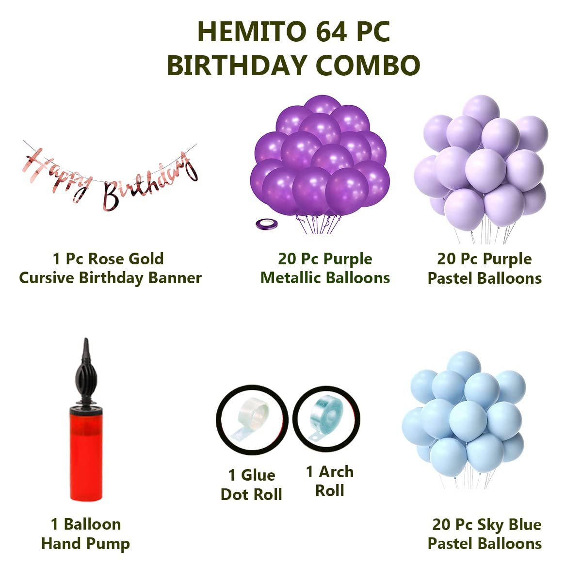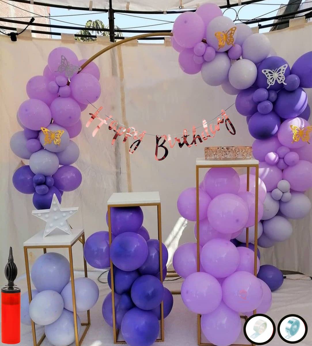 1pcs Rose Gold Happy Birthday Cursive banner, 20 pcs Purple Metallic balloons, 20 pc Purple Pastel balloons, 20 Pc Sky Blue Pastel Balloons 1 Glue Dot Roll , 1 Balloon Arch Roll with Balloon Hand Pump