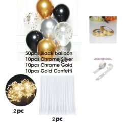 50 pcs Black Balloon, 10 pcs Chrome silver, 10 pcs Chrome Gold, 10 pcs Confetti Gold balloon, 2 pcs White Net, 2 pcs led fairy light, 1 roll glue dot, 1 roll arc,4 pcs small golden curling ribbon.