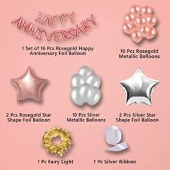 1 set of 16 Pcs Rosegold Happy Anniversary Foil Balloon, 2 Pcs Rosegold Star Shape Foil Balloons, 2 Pcs Silver Star Shape Foil Balloons, 1 Pc Fairy Light, 10 Pcs Silver Metallic Balloons, 10 Pcs Rosegold Metallic Balloons, 1 Pc Silver Ribbon.
