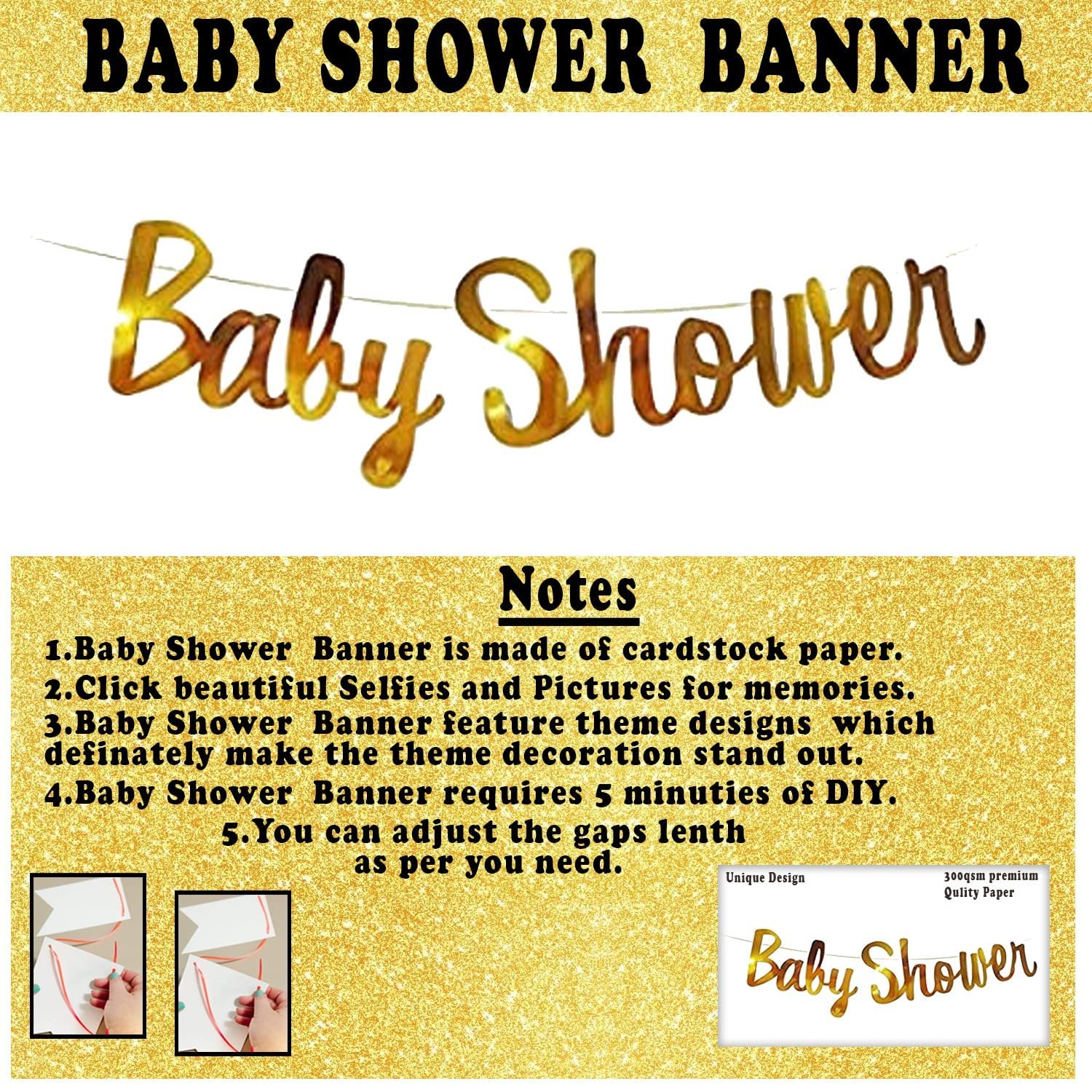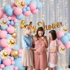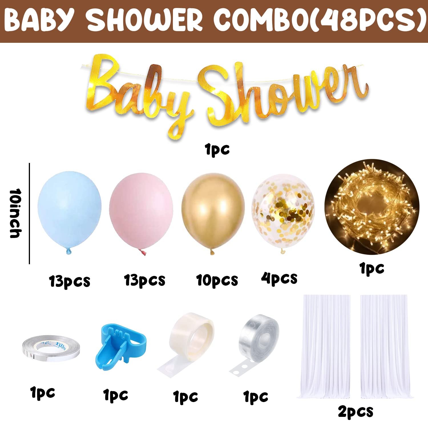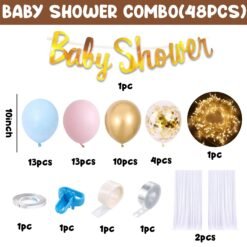 1pc golden foil baby shower banner (made of thick paper-cardstock), 1pc led fairy light, 2pcs white net for decoration, 36 pcs metallic balloons, 4pcs golden confetti, 1pc balloon curling ribbon, 1pc baby shower balloon garland arch and 1pc baby shower balloon glue dots and 1pc balloon knot.