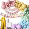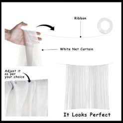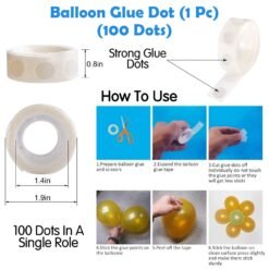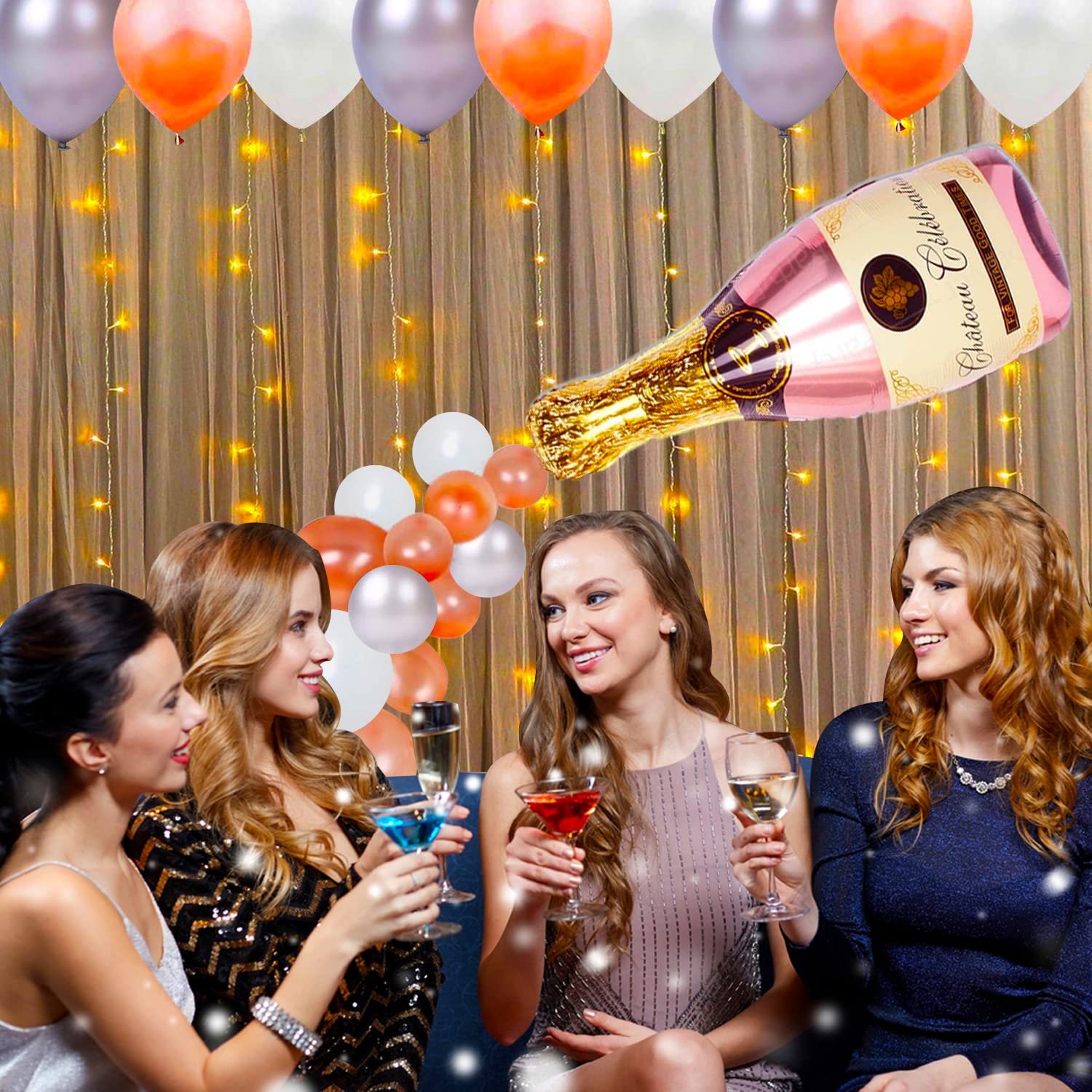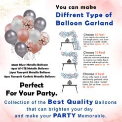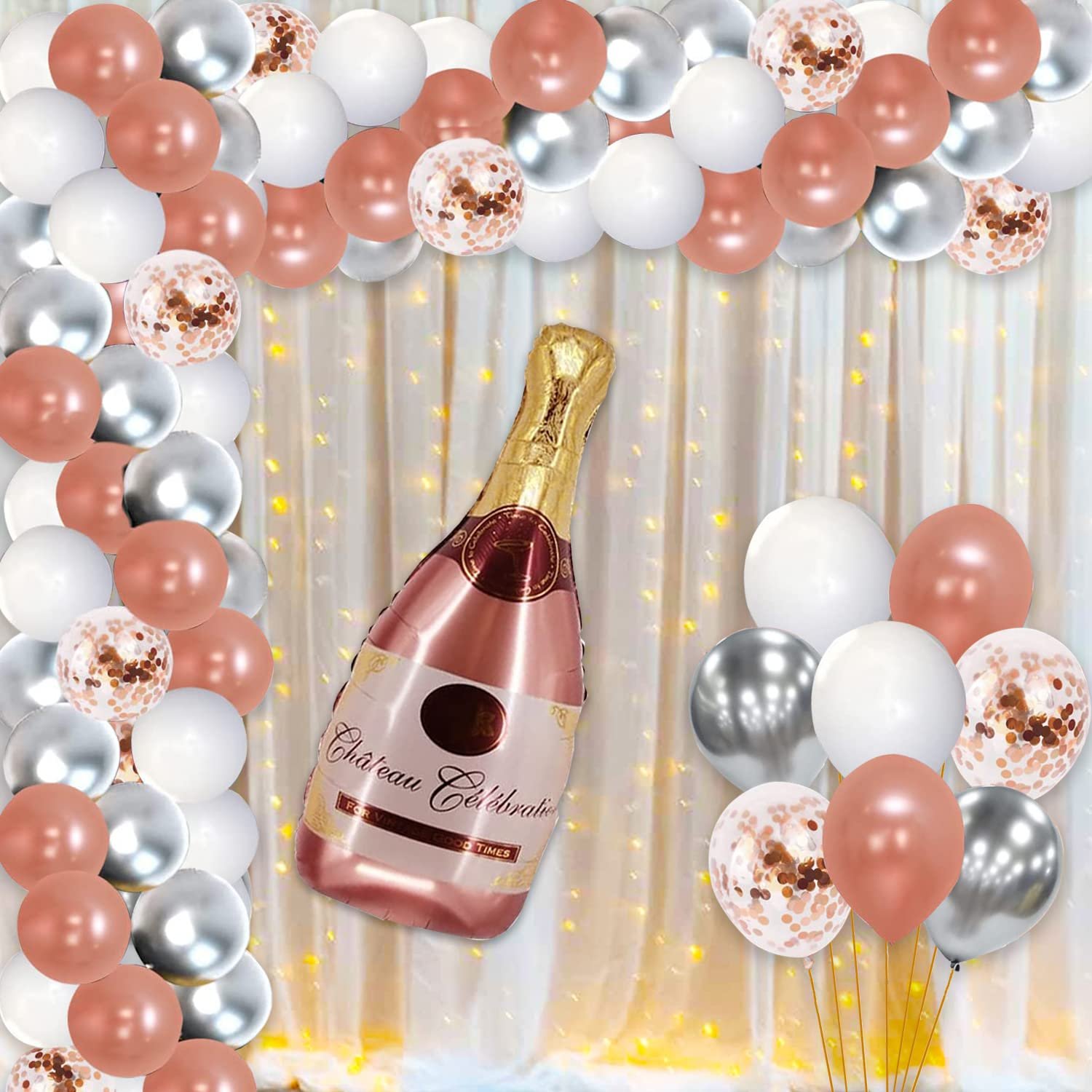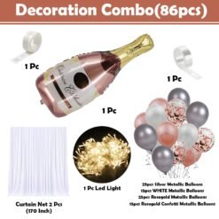 15 pieces of rose gold confetti balloons, 25 pieces of rose gold metallic balloons, 15 pieces of white metallic balloons, 25 pieces of silver metallic balloons, 1 piece of Champagne bottle foil balloon, 1 piece of glue dot roll, 1 piece of balloon arch, 2 pieces of net curtains, and 1 piece of LED string lights