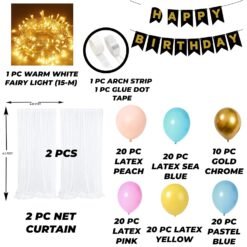 1 Pc Birthday Banner, 1 Pc LED Light Strip, 2 Pc Net Curtain, 1 Pc Arch Making Strip, 1 Pc Glue Dot Tape, 10 Pcs Golden Chrome Balloon, 100 Pcs Pastel Balloons Balloon