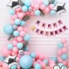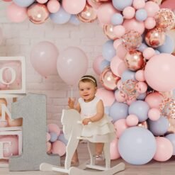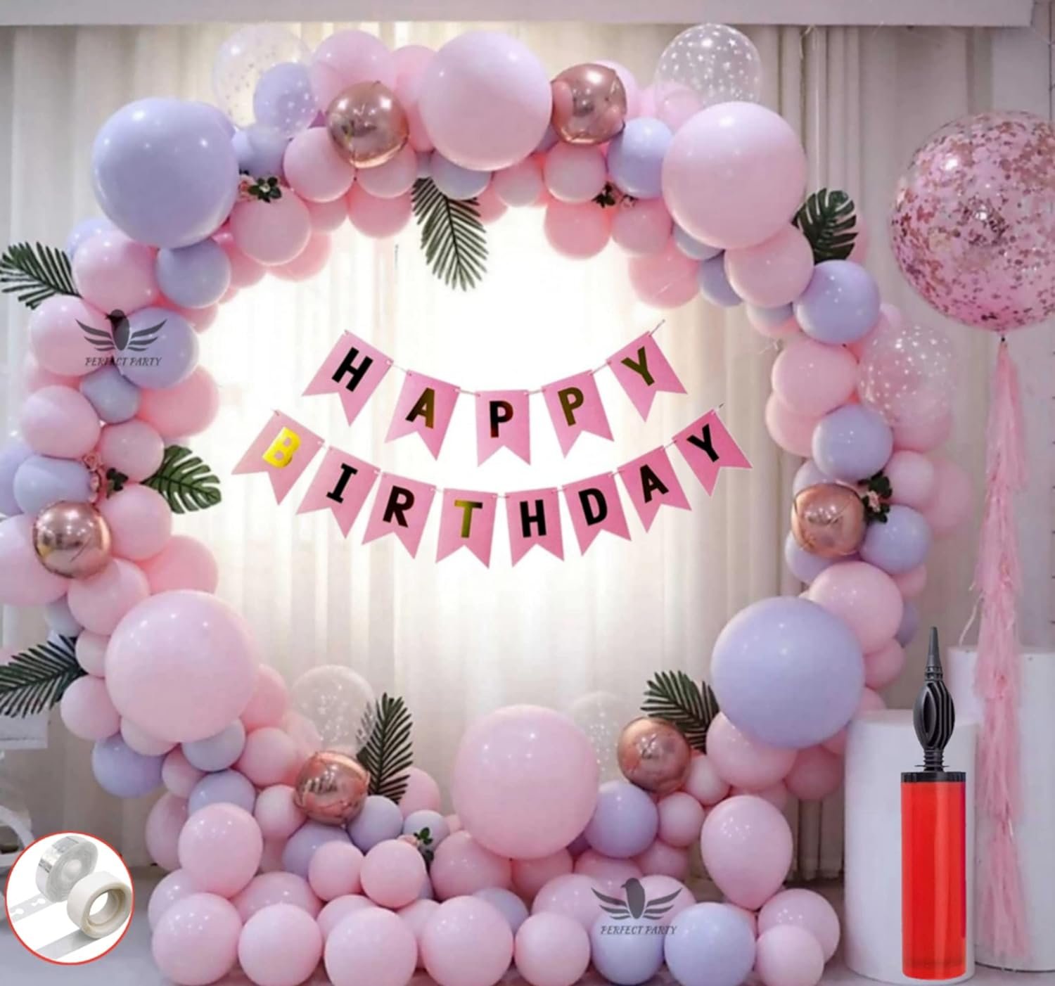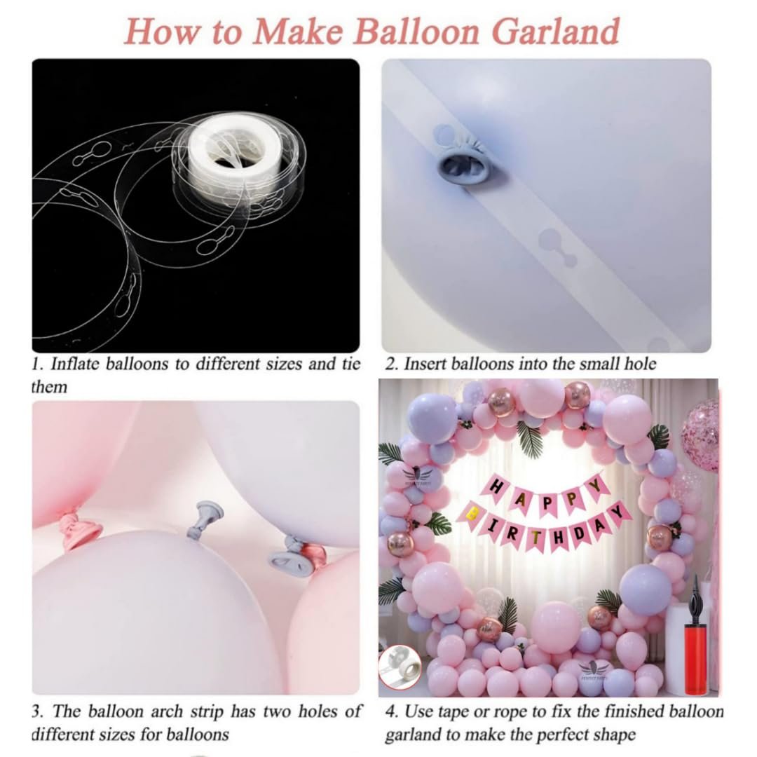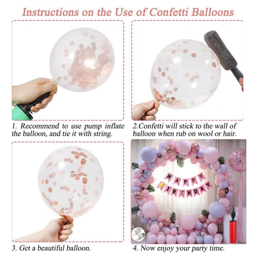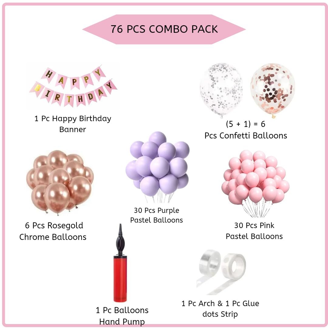 1 Pc Happy Birthday Cursive Banner (Rose Gold Color), 6 Pcs Confetti Balloons (5 Silver & 1 Rose Gold), 6 Pcs Rose Gold Chrome Balloons, 60 Pcs Pastel Balloons (Pink & Purple Color), 1 Pc Arch Strip, 1 Pc Glue Dot Strip, 1 Pc Balloons Pump.