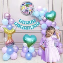Birthday decoration items for girls with Mermaid theme foil balloon set, happy birthday banner, Purple, Pearl white and Blue Balloons- 68 Items