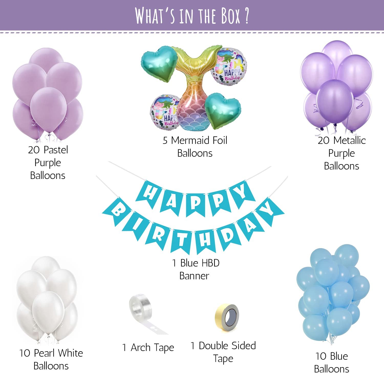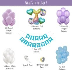 10 pcs Pearl White Balloons, 1 pc Arch Tape, 1 pc Double-sided tape., 10 pcs Blue Balloons, 5 Mermaid Foil Balloons set, 20pcs Metallic Purple Balloons,, , , , ,, 20 pcs Pastel Purple Balloons, 1 pc Blue HBD Banner