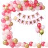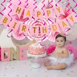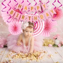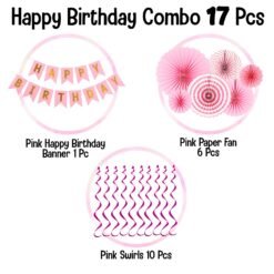 1pc pink happy birthday , 6pcs pink paper fan, 12pcs pink metallic swirls for birthday decoration items for girls.