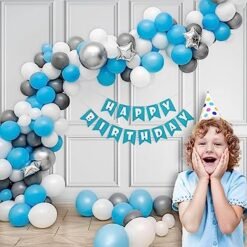 1 Double Sided Tape, 30 White Balloons, 1 Blue HBD Banner, 5 Silver Chrome Balloons, 30 Pastel Blue Balloons, 30 Grey Balloons, 4 Small Silver Star Foil Balloons, 1 Arch Tape