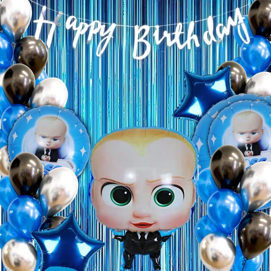 20 Blue, 20 Black, 20 silver Metallic Balloons, Boss Foil Balloon set of 5, 1 Birthday Banner, 2 blue foil curtain