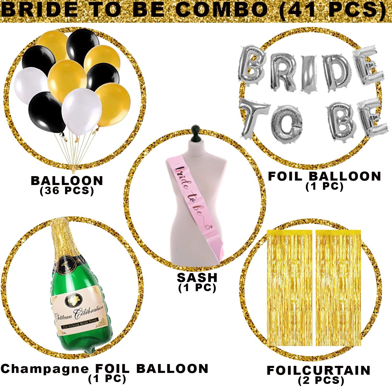 1pc bride to be silver foil balloon, 36pcs golden/black/white balloons, 1pc bride to be sash, 2pcs golden foil curtains, 1pc champagne foil balloon