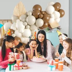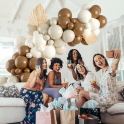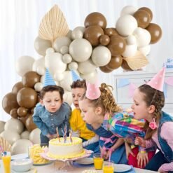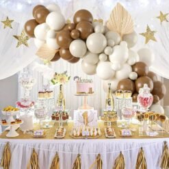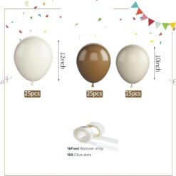 . It includes 25*10inch white balloons, 25*10inch Grey balloons, 25*10inch Brown balloons, 1 * balloon chain arc; 1 * Glue dot.