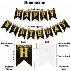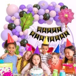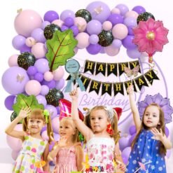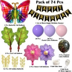 1 Set of Black Happy Birthday Banner, 1 Pcs Butterfly Foil Balloon, 2 Pcs Flower Foil Balloons, 2 Pcs Leaf Foil Balloons, 20 Pcs Dark Purple, 20 Pcs Light Purple, 20 Pcs Pink Latex Pastel Balloons, 5 Pcs Black Painted Balloons, 12 Pcs 3D Butterfly, 1 Roll Arch (5 Meter Approx), 1 Roll Glue Dots