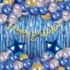 Dark Blue With Silver Happy Birthday Decoration Items Kit Combo Set Birthday Bunting Silver Foil Curtain Metallic Confetti Balloons With Hand Balloon Pump And Glue Dot - 62 pieces