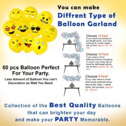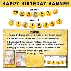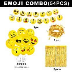 1pc emoji banner, 50pcs emoji theme balloon, 2pcs golden foil curtain and 1pc led light set
