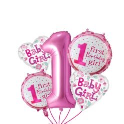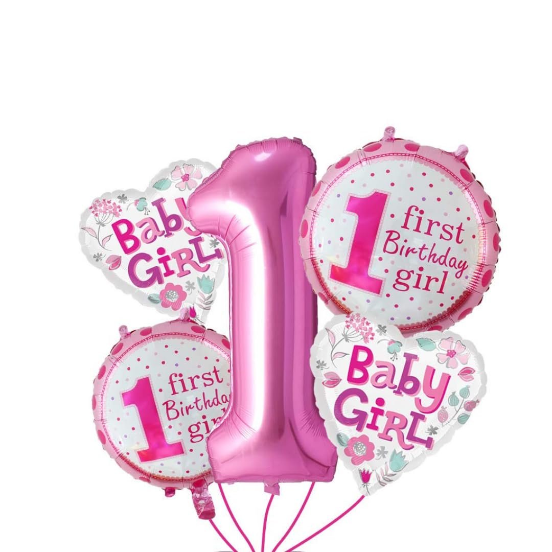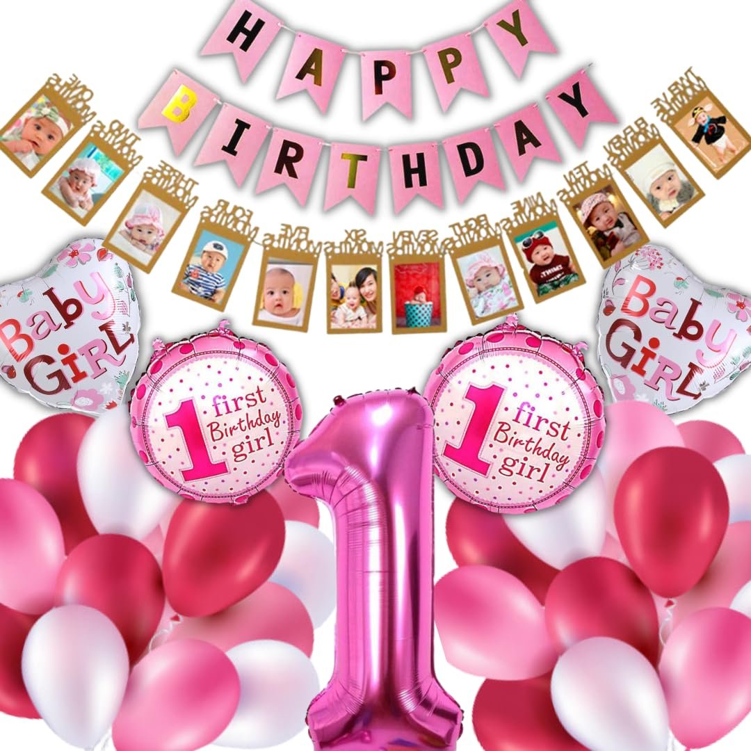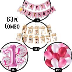 45 Multicolor Balloons, 1 Happy Birthday Banner, 1 1st birthday girl decoration set of 5, 1 photo banner