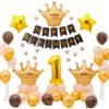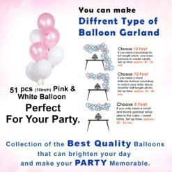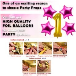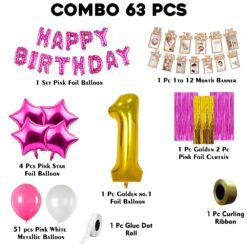 1pc pink polka dot HBD foil balloon, 1pc 1-12 month banner, 4pcs pink star foil balloon, 1pc golden number 1 foil balloon, 2pcs pink foil curtain, 1pc golden foil curtain, 51pcs pink and white metallic balloon, 1pc glue dot and 1pc ribbon.