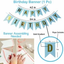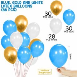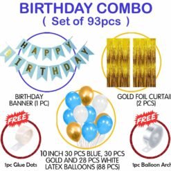 Happy Birthday Decorations Kit 93Pcs-Package include Package include 1pc blue happy birthday banner, 30pcs blue,30pcs gold and 28pcs white latex balloons,2pcs golden foil curtain, 1pc glue dot and 1 arc for any age boys Blue birthday decorations like 13th,15th,16th, 18th, 20,21st, 25th, 30th,40th, 50th, 60th, 70th, 80th. This balloon decoration combo packet has been curated after research by our Party Propz R&D team specially for Boys, kids, mens, husband quarantine or lockdown birthday parties.