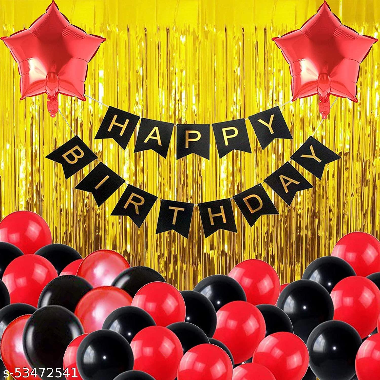 Happy Birthday Banner For Decoration Kit - 35 Pcs Combo Set - Black Happy Birthday Banner, Golden Curtain and Red Star Foil with HD Metallic Red and Black Latex Balloons