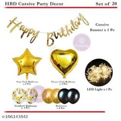 Happy Birthday Decoration Kit Combo Set of 20 Happy Bday Banner Led Light and Metallic Confetti Star Heart Shaped foil Balloons for for Baby Girls, Boys, Women, Wife Celebration Items