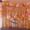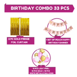 1 Pc Peach Happy Birthday banner + 2 Pcs gold Fringe Foil curtains + 30 Pcs Light Pink ,Gold , White balloons