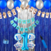 1 Blue birthday banner + 1 Pc 5 pcs First Birthday set + 2 Pcs Blue Fringe Foil Curtain + 1 Pc Silver Fringe Foil Curtains + 40 Pcs Blue Silver Balloons + 1 Pc Balloon Pump + 1 Pc Ribbon
