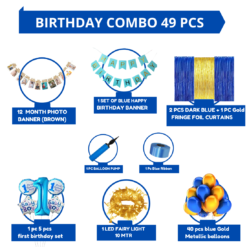 1 Blue banner + 1 Pc Brown 12 Month banner + 2 Pcs Blue fringe foil curtains + 1 pc Gold fringe foil curtains + 1 pc blue 5 pcs first birthday set + 40 pcs Blue gold Balloons + 1 Pc Blue ribbon + 1 Balloon Pump + 1 Pc LED Light