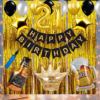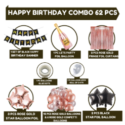 2 Pcs Rose Gold Fringe Foil Curtains + 1 Pc Black Birthday banner + 1 Pc Arch + 1 Pc Glue Dot + 3 Pcs Rose GOld star foil balloon + 2 Pcs Black Star Foil balloon + 45 Pcs Rose GOld balloon + 6 Pcs Rose Gold Confetti balloons + 1 Pc Lets Party Foil balloon