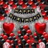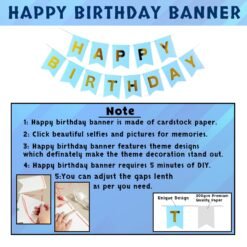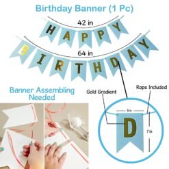 1Pc Blue Happy Birthday Banner (Made of thick Paper – Cardstock), 20Pcs Silver & 20Pcs White Metallic Balloon, 10Pcs Blue Chrome Balloons, 1Pc Arch Strip Roll for birthday.