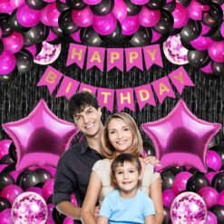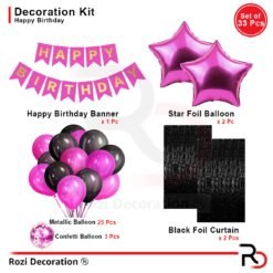 Happy Birthday Party Decoration Combo Set Contains Banner, Confetti Metallic Balloons, Foil Fringe Curtain | Pink & Black Pack of 33 Pcs