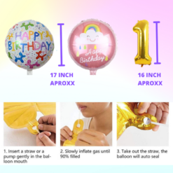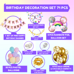 1 PC Pink HAPPY BIRTHDAY BANNER + 1 Pc Gold Penant + 1 SET OF 18 PCS PROPS + 1 PC LED light + SET OF 5 PCS RAINBOW FOIL BALLOON + 1 PC BALLOON ARCH + 1 PC BALLOON GLUE DOT + 50 PCS PASTEL BALLOONS + 10 PCS CHROME BALLOON + 4 PCS CONFETTI BALLOONS