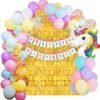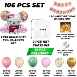 1 Pc Hello Kitty Shape Foil Balloon, 2 Pcs Round Happy Birthday Printed Foil Balloon, 2 Pcs Pink Heart Foil Balloon, 1 Pc Matching Birthday Banner, 2 Pcs Net Curtain, 1 Strip LED Lights, 20 Pcs Retro Pink latex Balloons, 20 Pcs Skin Color Latex Balloons 20 Pcs Mint Green Balloons, 20 Pcs Pastel Pink Balloons, 5 Pcs Golden Confetti Balloons, 10 Pcs Golden Chrome Balloons, 1 Pc Arch Making Strip and 1 Pc Glue Dot Tape