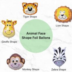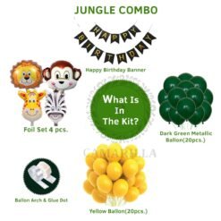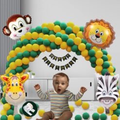 13 letters happy birthday banner, 1pc each balloon arch strip and glue dot, 20pcs dark green metallic balloons, 20pcs yellow metallic balloons, 4Pcs safari animal foil balloons.