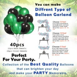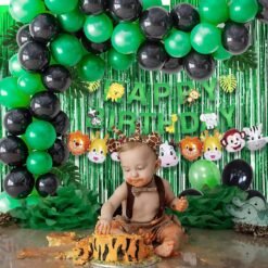 1pc jungle theme happy birthday paper bunting, 1pc jungle character foil balloon, 20pcs green-20pcs black metallic balloon, 3pcs green leaf and 1pc green foil curtain.