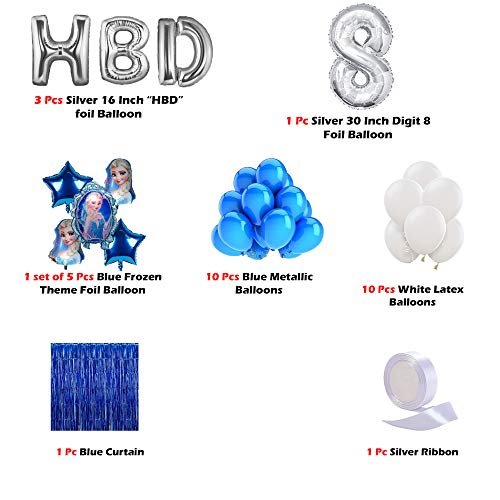Kids Frozen Theme 8th Birthday Balloon Decoration Item – Combo 27 Pcs – Silver Digit Foil Balloon, Frozen Theme Foil Balloon, Blue Curtain