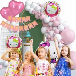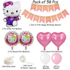 1 Set of Pink Happy Birthday Banner, 1 Pcs Kitty Foil Balloon, 2 Pcs Round Foil Balloons, 2 Pcs Heart Foil Balloons, 25 Pcs White Balloons, 25 Pcs Pastel Pink Balloons, 1 Roll Arch (5 Meter Approx), 1 Roll Glue Dots