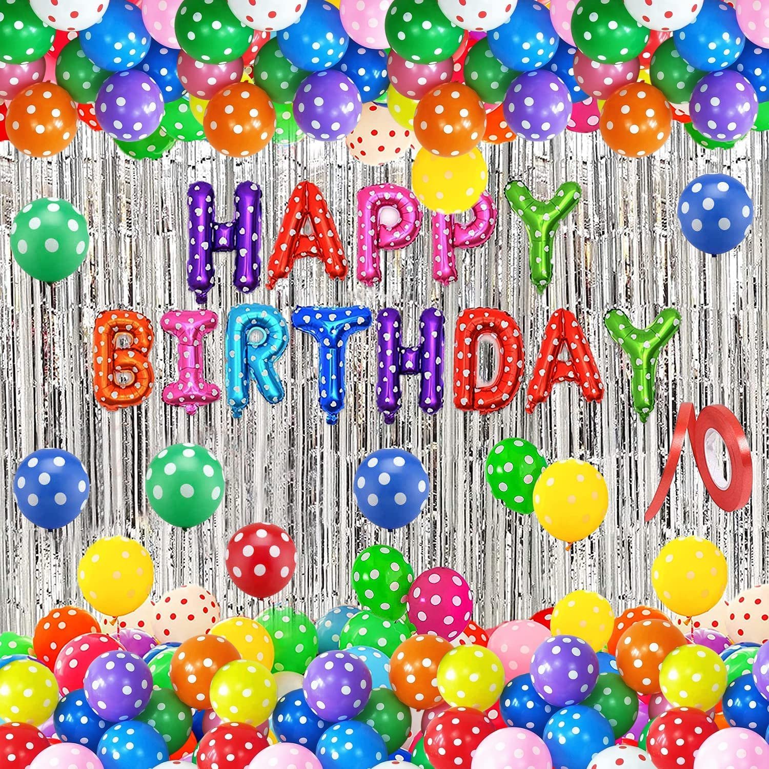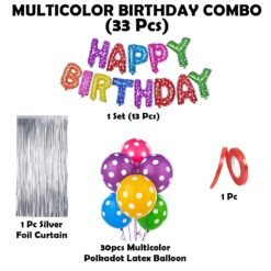 PREMIUM BALLOON DECORATION KIT – This exclusive multicolor polka dot foil and metallic balloons kit has 33Pcs in a packet. 1 set multicolor polka dot alphabet happy birthday foil balloon, 30Pcs multicolor polka dot balloons, 1pc silver foil curtain, and 1pc ribbon for multicolor balloons for decoration or happy birthday decorations items for boys, kids.