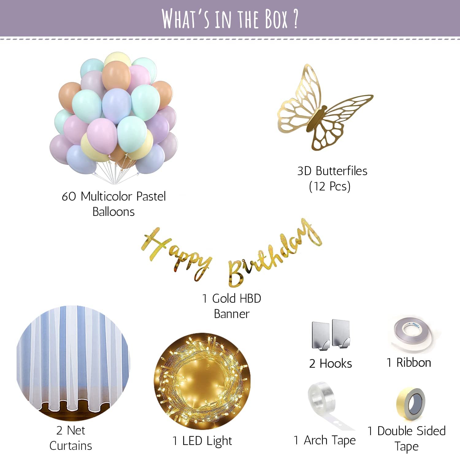 EVERYTHING YOU NEED INCLUDES?: Our butterfly theme birthday party decorations package contains premium 60 pcs multi color Balloon , 2 pcs Net curtains ,1pcs Cursive Happy Birthday Banner, 12 pcs 3D Gold Butterflies Balloon Garland Accessories Kit ( 1pcs Arch tape, + 1 pcs ribbon, + 1 pcs Double-sided tape, + 2 pcs Hooks).