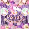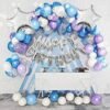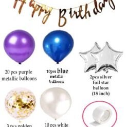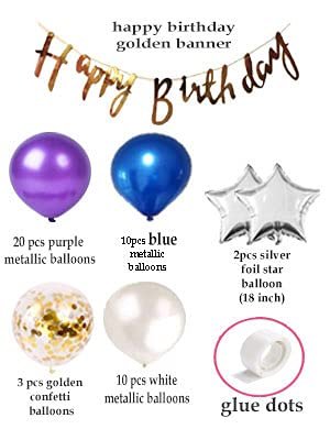 happy birthday’ golden banner(1 set), 20pcs purple metallic,10pcs blue metallic,10pcs white metallic,3pcs golden confetti balloons,2pcs silver foil star balloon,glue dots.