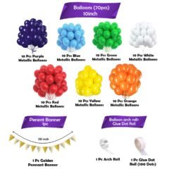 APPY BIRTHDAY DECORATION KIT INCLUDES: 10pcs purple/10pcs blue/10pcs green/10pcs white/10pcs red/10pcs yellow/10pcs orange metallic balloons, 1pc golden pennant banner (cardstock), 1pc balloon arch, 1pc glue dot roll.. This multicolor birthday decor looks very pretty in girls bday decorating and is perfect for creating the ultimate birthday celebration vibe!