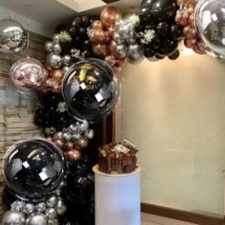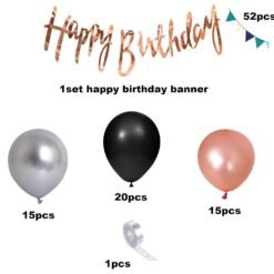 15pcs of silver balloons, 15 pcs of rose gold balloons, 20 pcs of black balloons , 1 pc golden happy birthday banner , 1 pc arc