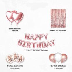 2 Pcs rosegold heart shape foil balloon, 10 Pcs white latex Balloon, 1 Pc Ribbon, 1 Set of Happy Birthday rosegold foil balloon, 1 Pc Rosegold Foil Curtain, 10 Pcs golden confetti,, 10 Pcs rosegold metallic balloon,