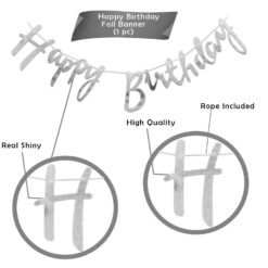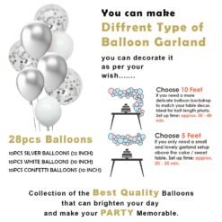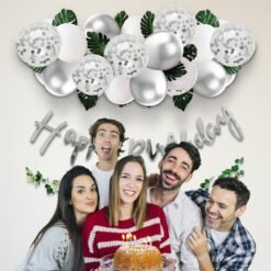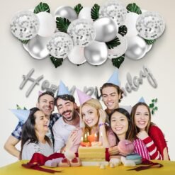 1pc silver happy birthday foil banner, 10pcs silver balloons, 10pcs white balloons, 8pcs silver confetti, 5pcs artificial leaves, 1pc artificial leave garland, 1pc balloon arch, 1pc glue dot roll