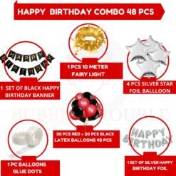 This Package Includes 1 Pc Happy Birthday Foil (Silver) +1 Pc Happy Birthday Banner (Black) + 4 Pcs Star foil balloons (Silver) + 1 pc fairy Light + 1Pc Glue Dot + Pack of 40 HD Metallic Balloons (20 Pcs Red, 20 Pcs Black )