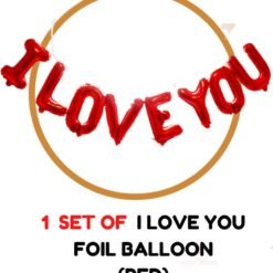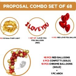 1 Pack of I Love You Foil Balloon (Red) + 1 Pc LED Fairy Light + 4 Pcs Heart Foil ( Red) + 1 Pc Arch + 25 Pcs Burgundy Balloon + 20 Pcs Red balloon + 6 Pcs Gold Confetti Balloon + 10 Pcs Gold Chrome balloons