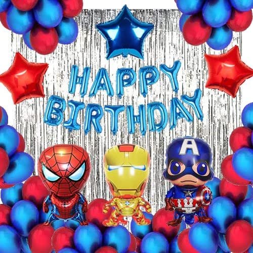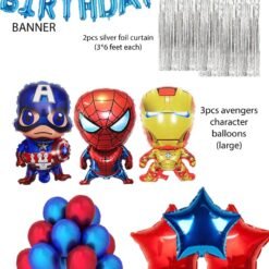 “HAPPY BIRTHDAY” banner(13 piece), 15pcs blue metallic, 15pcs red metallic, 3 pcs avengers character balloons (large), 3pcs red and blue meatllic foil star balloons