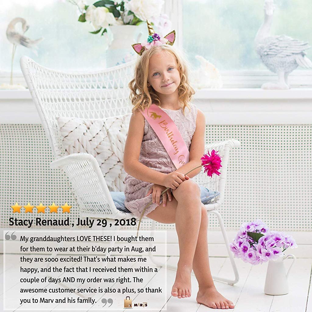 1 x Gold Glitter Unicorn Horn Headband, 1 x Pink Birthday Sash for Girls